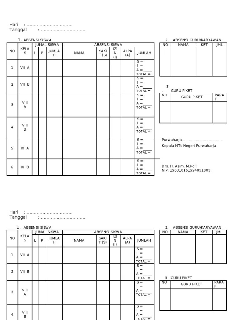 Contoh format buku piket harian guru paud tk kober tpa administrasi paud. Contoh sk piket guru sd, smp, sma dan smk format word sk iket guru untuk memperlancar pelaksanaan tugas kepala sekolah di dalam pengelolaan administrasi dan kependidikan di sd negeri ihamahu sehingga dapat berjalan dengan tertib, aman dan teratur maka dipandang perlu menunjuk guru untuk menjadi wali kelas dan guru piket tahun ajaran : Pengertian buku piket adalah buku yang digunakan oleh petugas piket sekolah yang harus diisi sesuai dengan temuan dan keadaan yang terjadi. Contoh buku piket guru dan karyawan diadakan sebagai penunjang efektivitas kegiatan belajar mengajar di sekolah, piket guru secara umum lebih kepada pemantauan kelas yang kosong atau tidak ada guru pada saat jam pelajaran berlangsung. Ini sebagai salah satu administrasi yang haruslah dibuat petugas piket baik untuk mencatat kehadiran guru ataupun siswa.
