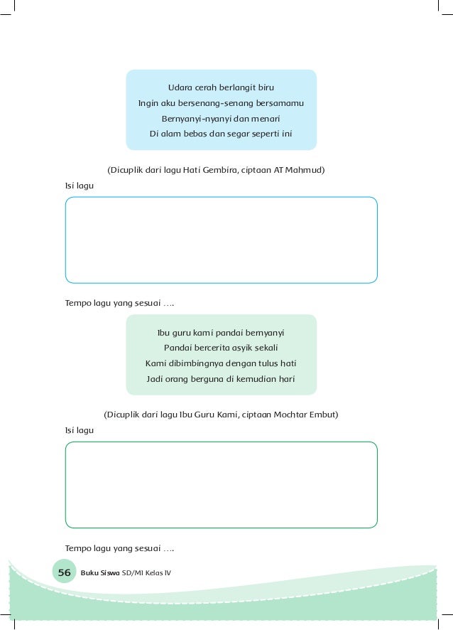 Cita Citaku Tema 6 Buku Tematik Terpadu Kurikulum Buku Siswa Sd Mi Kelas Iv Pdf Download Gratis from docplayer.info Kunci jawaban tema 6 kelas 4 halaman 48. Tuliskan isi syair lagu pada bait kedua! Tuliskan isi syair lagu pada bait pertama! Bacalah syair lagu aku ingin jadi penerbang! Tuliskan isi syair lagu pada bait pertama! Dengan kata lain lagu memiliki suara vokal sedangkan musik hanya instrumennya saja. Lagu pop modern senantiasa berkisah tentang perasaan hati. Di artikel ini akan menemukan berbagai macam kata kata bijak, dari mulai kata bijak cinta, kata bijak romantis, kata bijak motivasi, kata bijak kehidupan, kata…