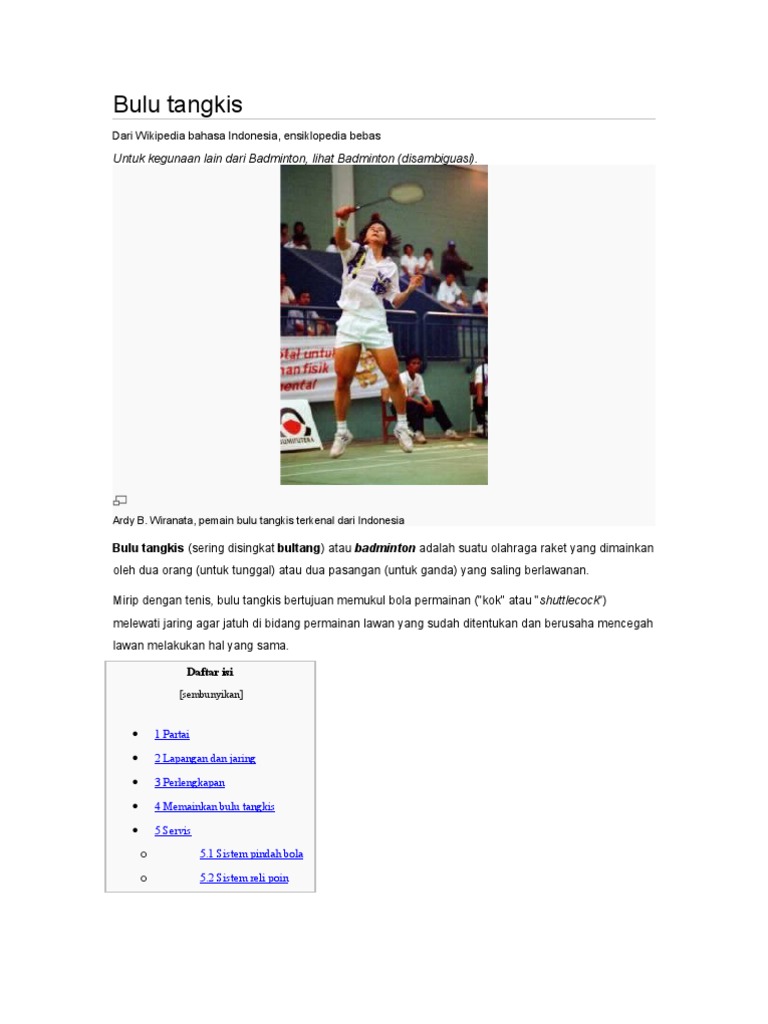 Misalnya, dalam pertandingan dengan nilai 15, bila kedua belah pihak telah mencapai angka 14 sama. Semakin banyaknya orang yang berminat menekuni olahraga yang satu ini. Bulu tangkis adalah salah satu olahraga yang paling populer di indonesia. Buatlah rangkumam aktivitas permainan bola besar! Indukorganisasi bulu tangkis nasional adalah pbsi (persatuan bulu tangkis seluruh indonesia) peraturan dalam permainan bulu tangkis sebagai berikut. Permainan bulu tangkis ini sangatlah terkenal, sampai salah satu majalah di inggris yang bernama punch mempublikasikan bahwa permainan bulu tangkis merupakan salah satu permainan olahraga kelas dunia. Bulu tangkis adalah salah satu cabang olahraga yang banyak digemari oleh masyarakat indonesia bahkan dunia. Bulu tangkis, nama itu pasti tidak asing lagi di telinga anda. Permainan bulutangkis harus dibina sejak usia dini untuk menghasilkan bibit atlit yang berpotensi. Pemain juga harus mencoba mencegah lawannya melakukan hal tersebut kepadanya. Ada beberapa kejuaraan bergengsi dalam pertandingan bulu tangkis. Olahraga bulu tangkis mirip dengan tenis, bulu tangkis bertujuan memukul bola permainan ('kok' atau 'shuttlecock') melewati di atas jaring net agar jatuh di area permainan lawan dan mencegah lawan untuk melakukan hal yang sama. Banyak atlet indonesia yang telah membangkan tanah airnya di kancah dunia.